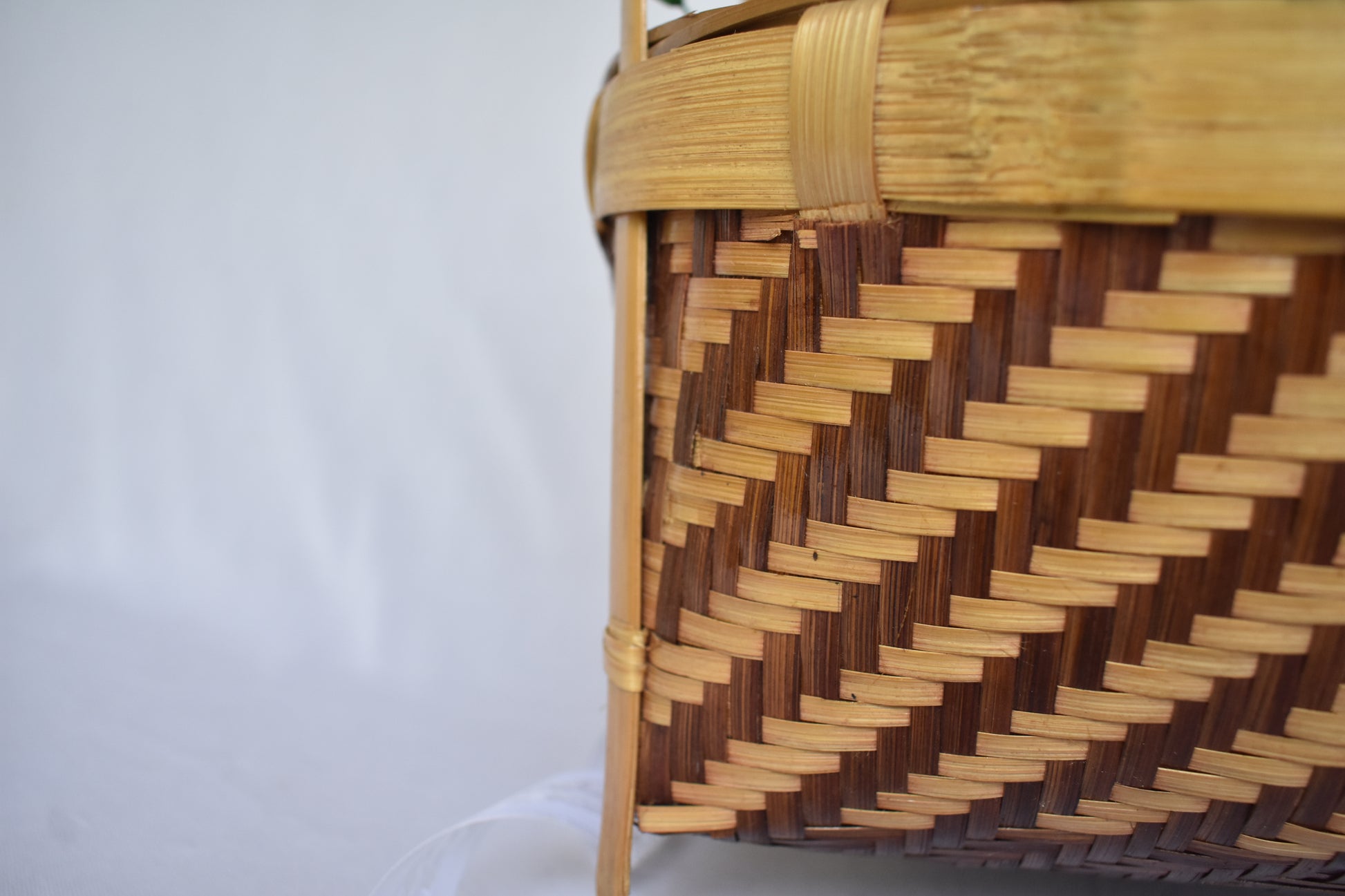 Handcrafted bamboo basket with a sturdy handle, ideal for storage or decorative use.
