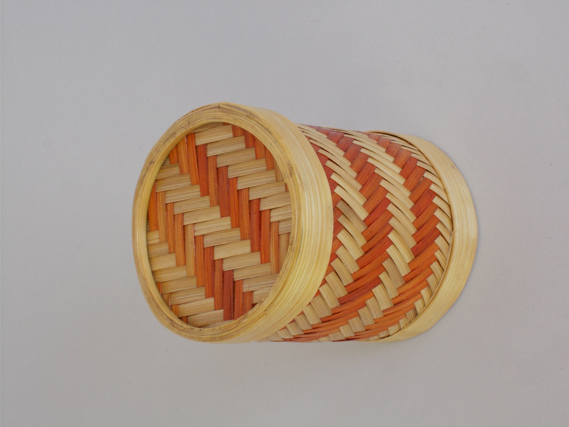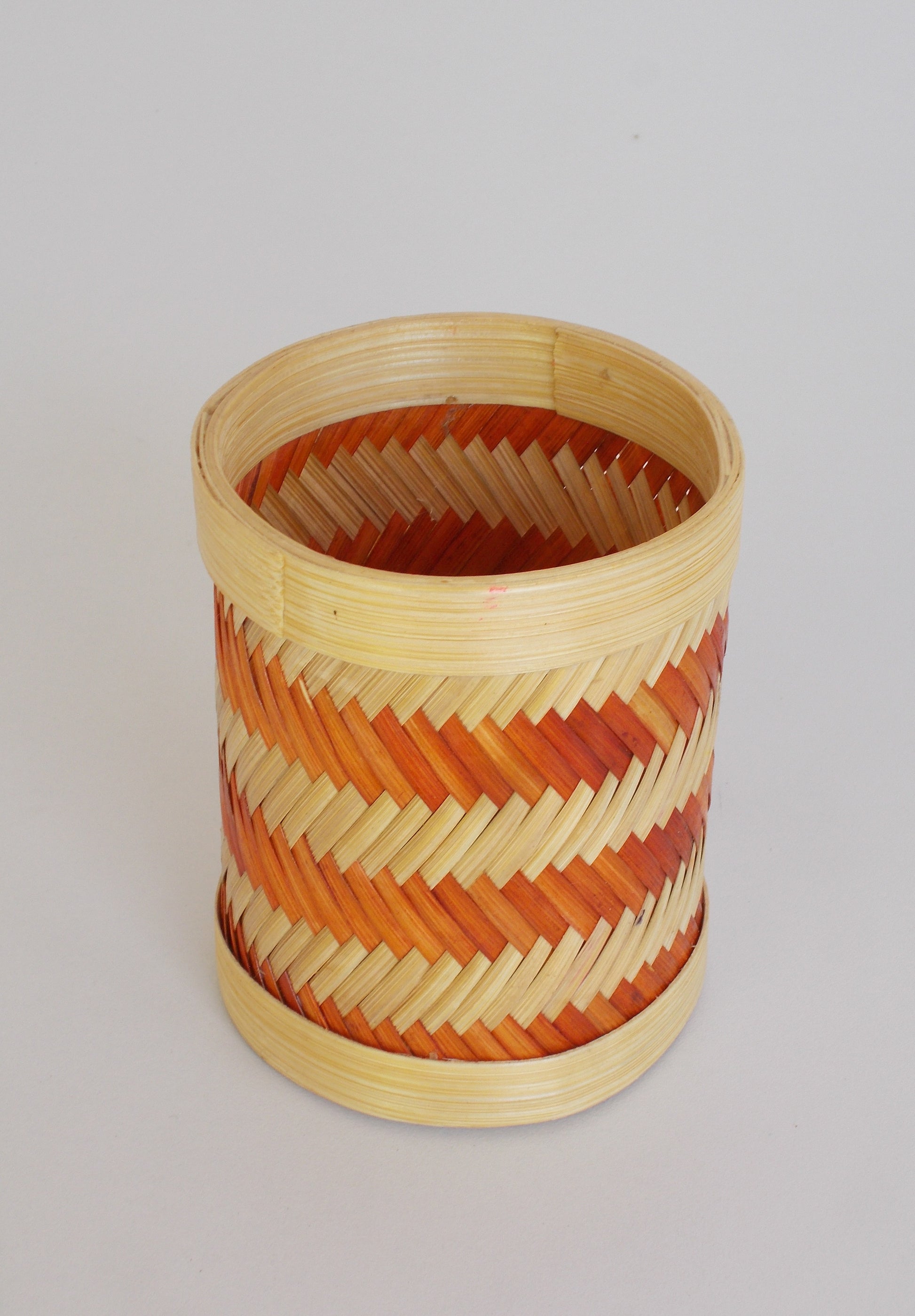 This cylindrical bamboo pen stand features a lively chevron weave in warm orange and natural hues. Handcrafted for charm and durability, it adds an earthy elegance to your workspace.